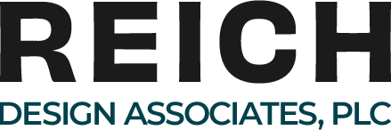 Two-story brick house with large windows, a pointed roof, a front porch, and surrounding greenery under a blue sky.